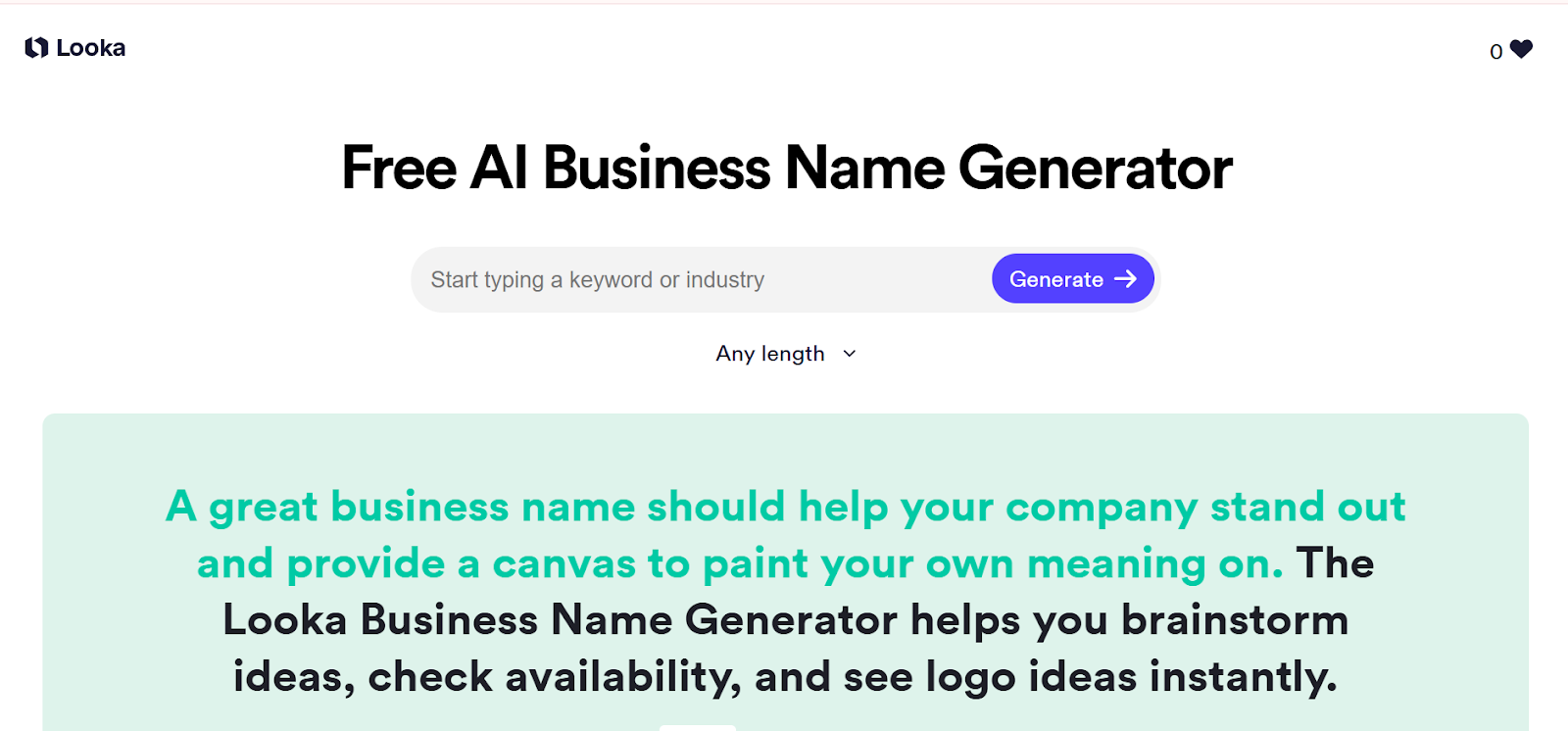 Pour les utilisateurs qui souhaitent une liste de noms innovants avec un contrôle de leur disponibilité et la création de composants de marque, tels que des logos, Looka est l'outil idéal. La seule chose que les utilisateurs doivent faire est de fournir un ou plusieurs mots clés autour desquels ils souhaitent que les noms soient générés.
