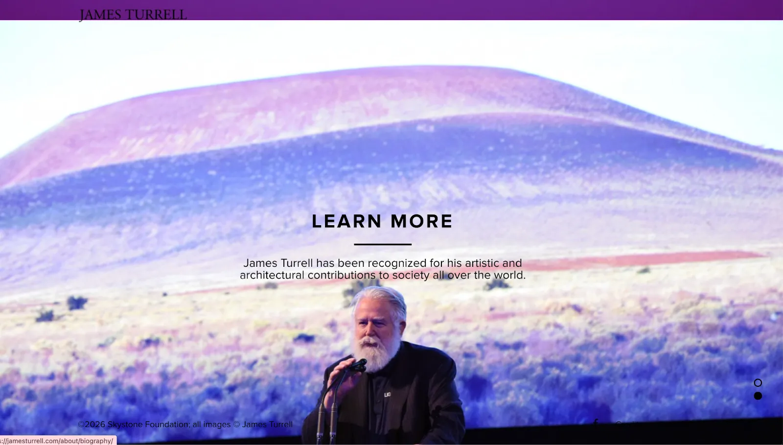 The website created by James Turrell is intentionally slow and minimalistic, as it resembles the experience of his work. Project pages are long-form and image-led, often accompanied by minimal explanatory text that encourages contemplation rather than consumption. Navigation avoids urgency, allowing visitors to move through Skyspaces and installations in a way that echoes the physical experience of time and light.