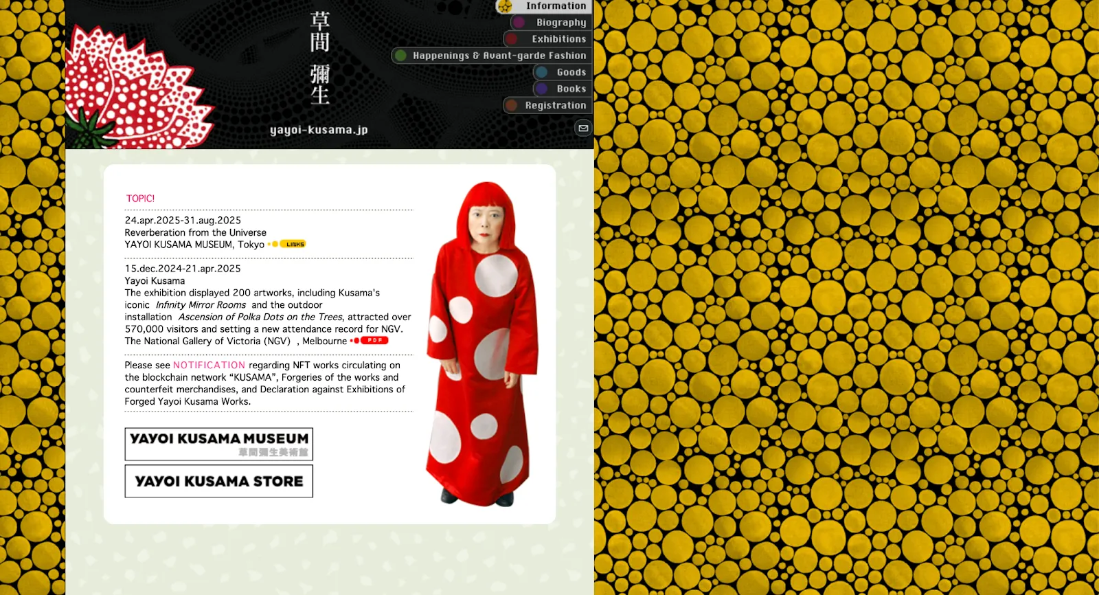 Yayoi Kusama’s website reflects her unique visual language, although it is strictly structured. The content is well divided into sections such as biography, exhibitions, publications, and works, which is why it does not feel like visual overload despite her extreme aesthetic. The site also serves as a brand anchor and a source of information, so that visitors are not lost in its identity.