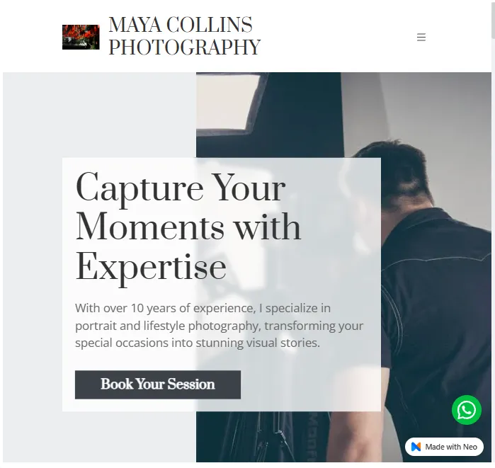 This photography portfolio template presents a calm, refined layout that puts storytelling and professionalism first. The split-screen structure balances a soft, neutral background with a behind-the-scenes studio image, subtly highlighting the photographer’s process without overpowering the page.