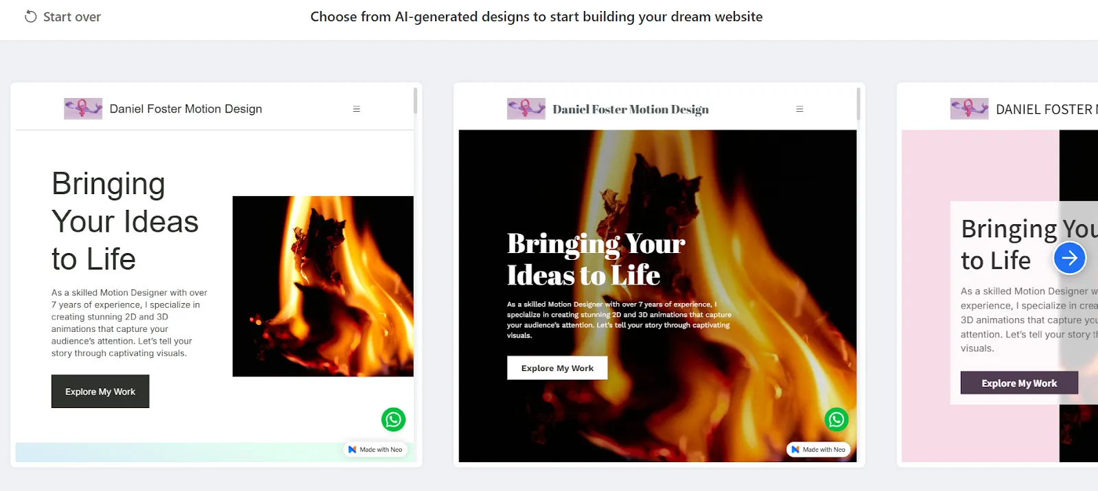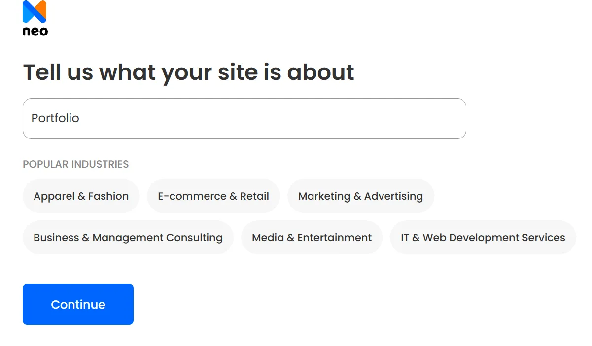 For example: Neo Sites is one of AI-powered website builder that generates around 9 tailored templates for your given website idea. It is easy to get started with this platform. Here’s how: