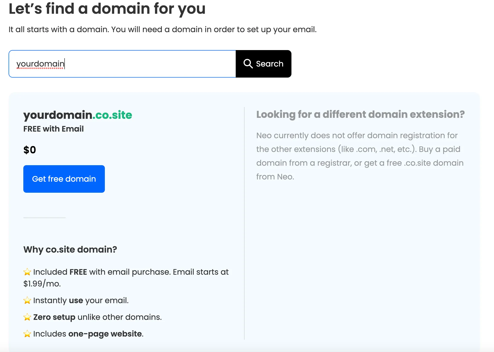 Neo is a great solution when you need temporary business email which can be entirely customized to match your business or brand (for example, john@weddingdelights.co.site). With no lock in, you can get Neo Mail with a monthly subscription which you can stop once your project is over. What’s more, if you have a domain name you already own, you can also get Neo Mail for free for the first month, making it the perfect solution to get started with.