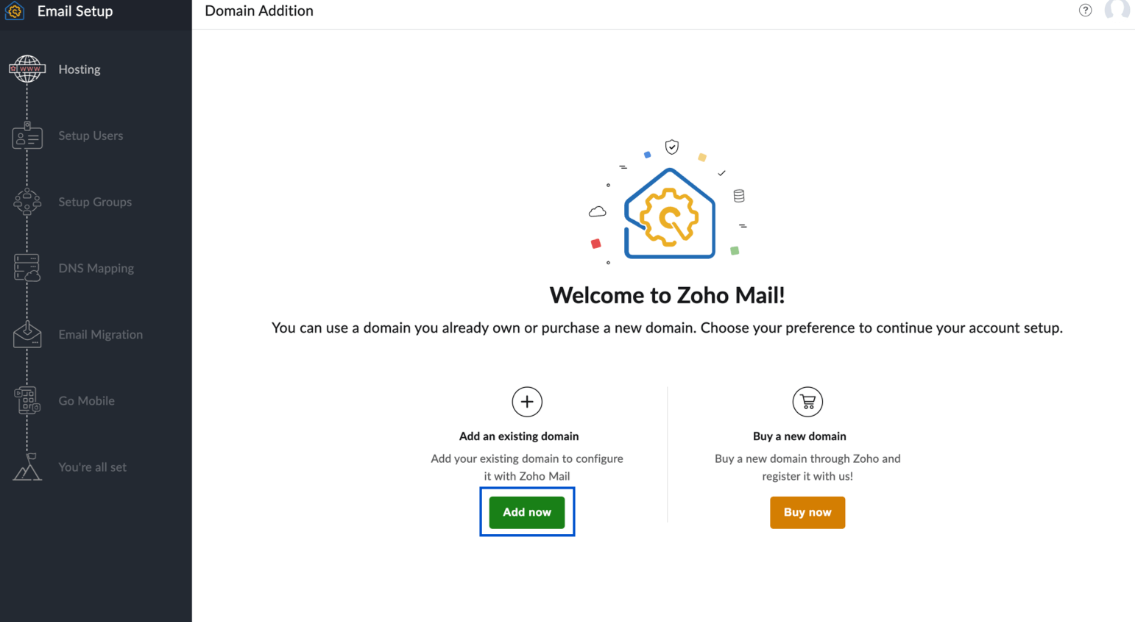 To create a free small business email account with Zoho, you need an active domain (you can either use a domain you already own or buy a new one with Zoho).