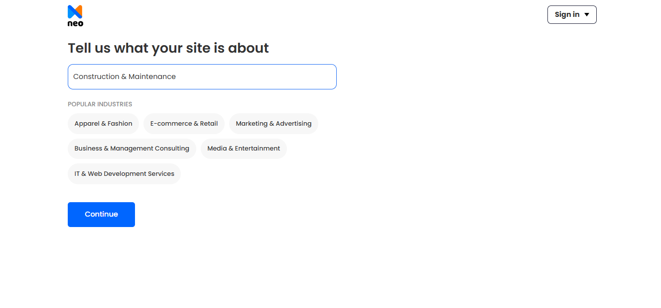 Step 5. However, you must sign in (if you’re an existed user) or create a customer account (if you’re a new user) on the Neo page to save your edits. This will allow you to change images, customize colors and fonts, and publish your construction business site on a custom domain.