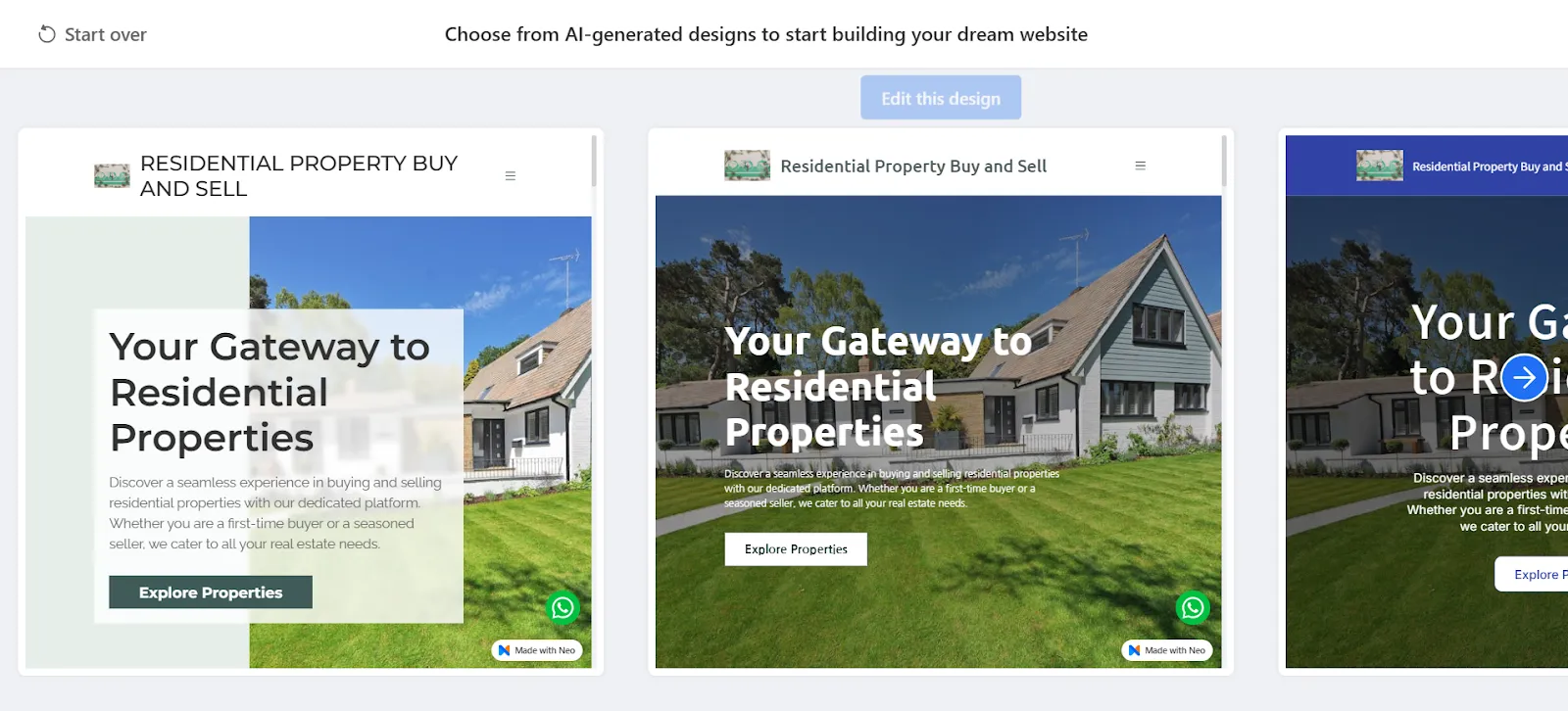 4. Neo Sites will create different website options according to your description. You can select the design which you find the most appropriate. And click on ‘Edit this design’.
