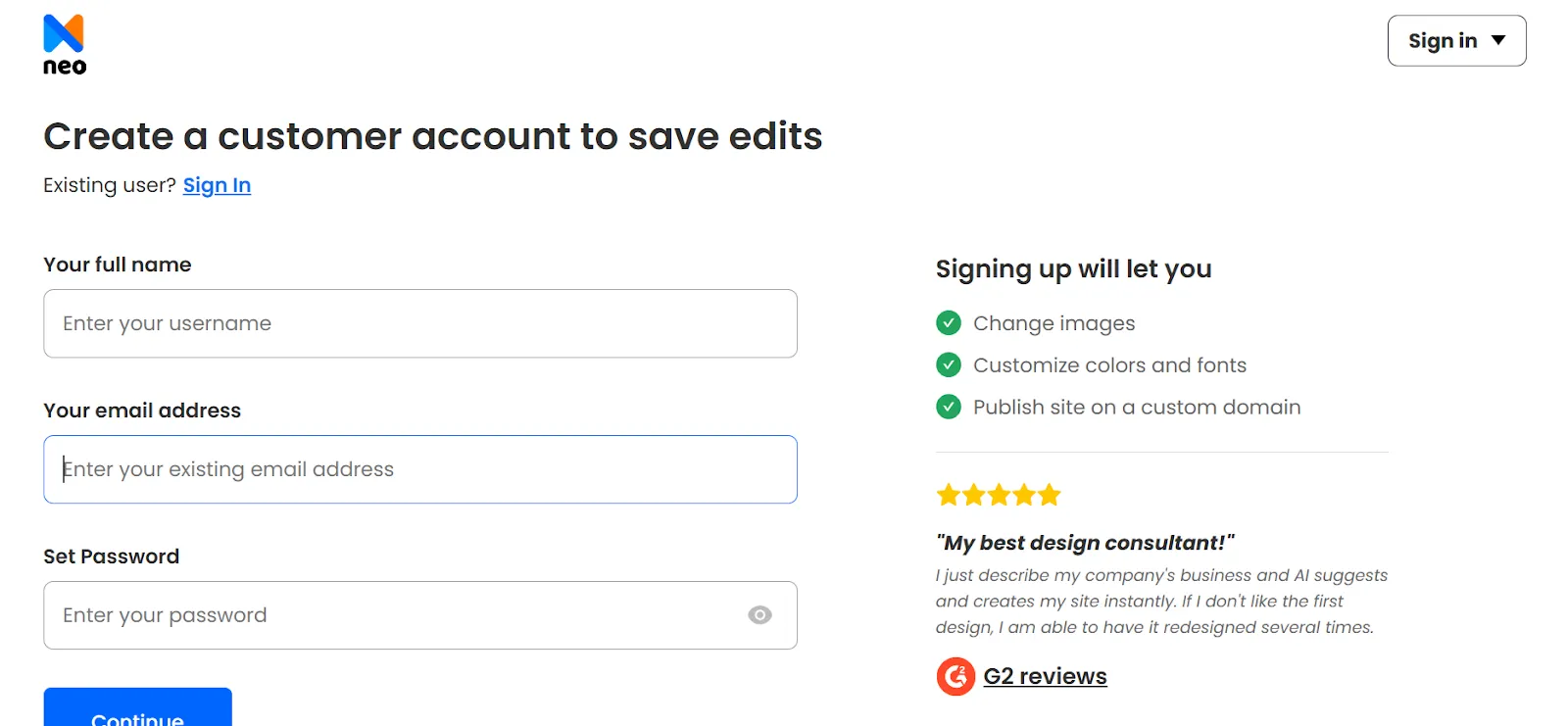 5. But before you edit the design, Neo Sites will ask you to create a customer account. Enter all the required information and create the account.