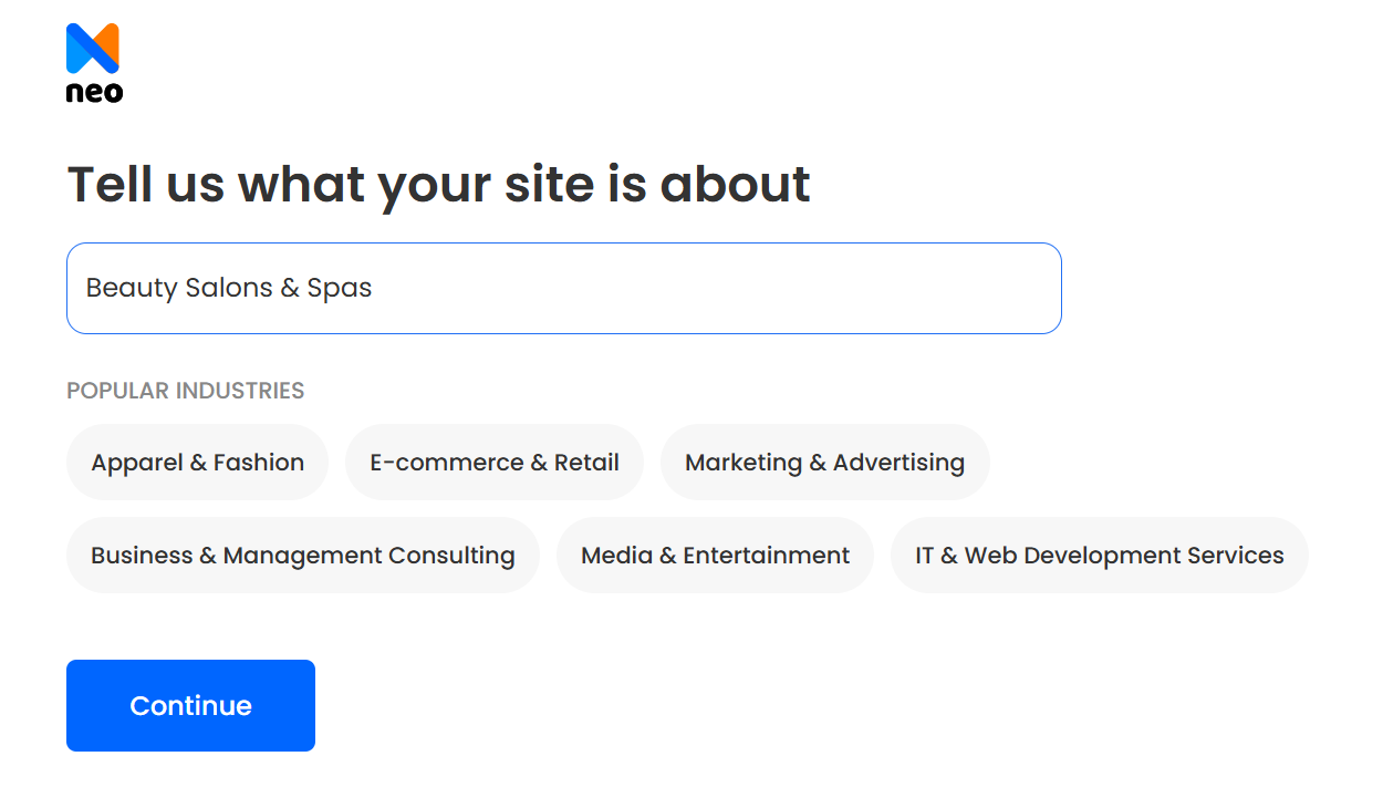 - Select the relevant category, such as ‘Beauty Salon & Spas’ and then click on ‘Continue’.