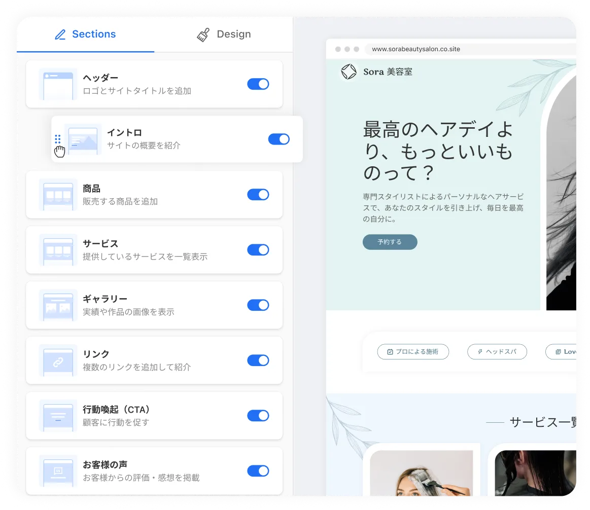 サービス紹介や商品ページなど、すぐに使えるセクションが用意されています。
