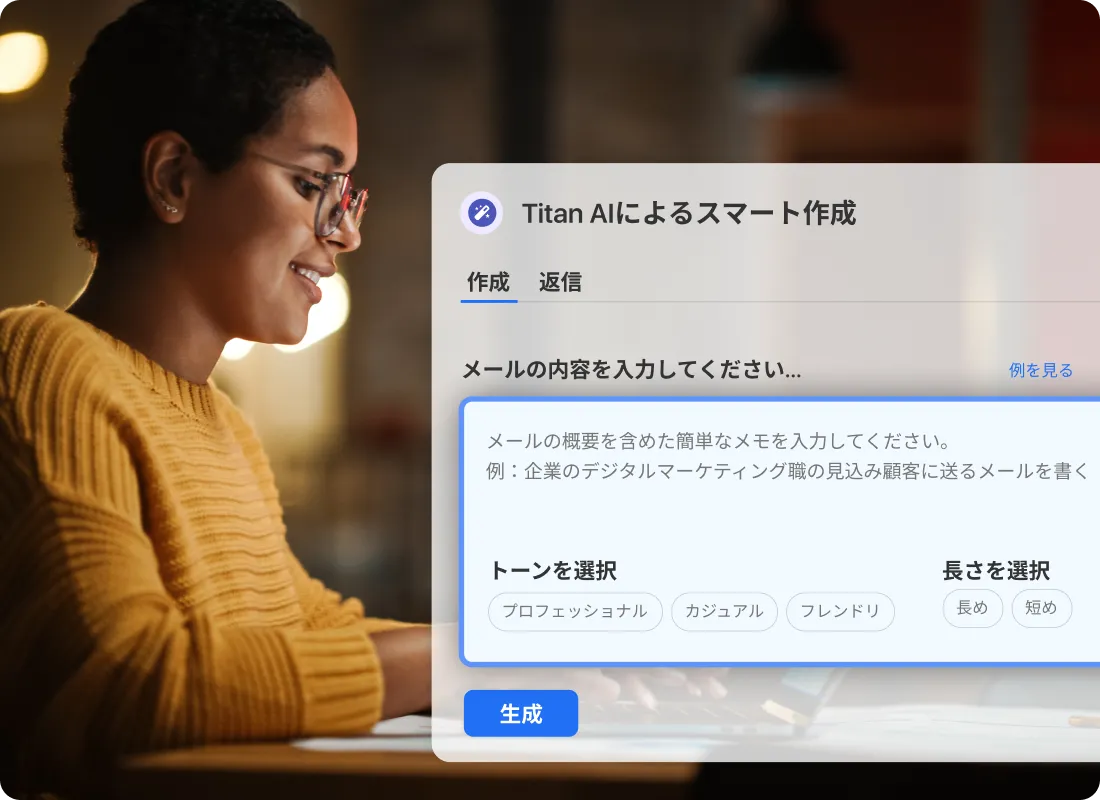 SmartWriteを使えば、メール作成が簡単になります。伝えたい内容を指定し、語調や長さを選ぶだけです。AIのメールライティングアシスタントが第一稿を生成するので、それを確認・修正して素早く送信できます。
