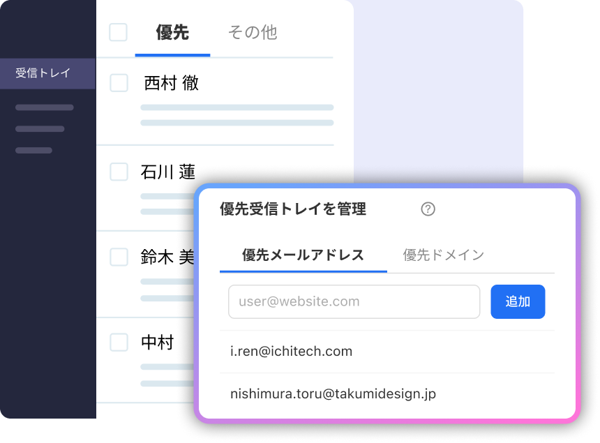 特定の送信者やドメイン全体を優先に指定できるので、重要な相手からの連絡をすぐに確認して対応できます。