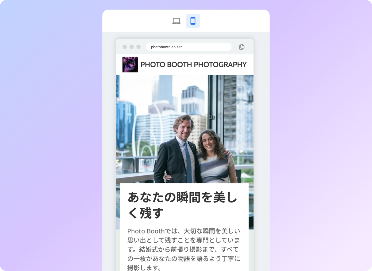 Neo Sitesのモバイル対応デザインで、どのデバイスでもサイトが美しく表示されます。見込み客はスマートフォン、タブレット、デスクトップであなたの作品を簡単に閲覧できます。