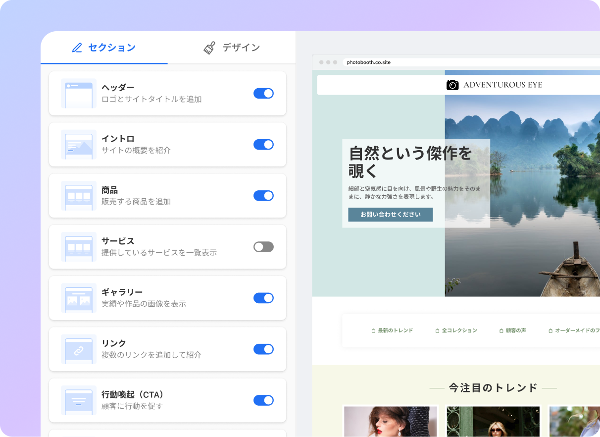 Neo Sitesのカスタマイズ可能なデザインオプションで、サイトを独自のスタイルに合わせましょう。色やフォント、レイアウトを調整したり、写真家向けテンプレートを変更したりして、ブランドの個性を完璧に表現します。